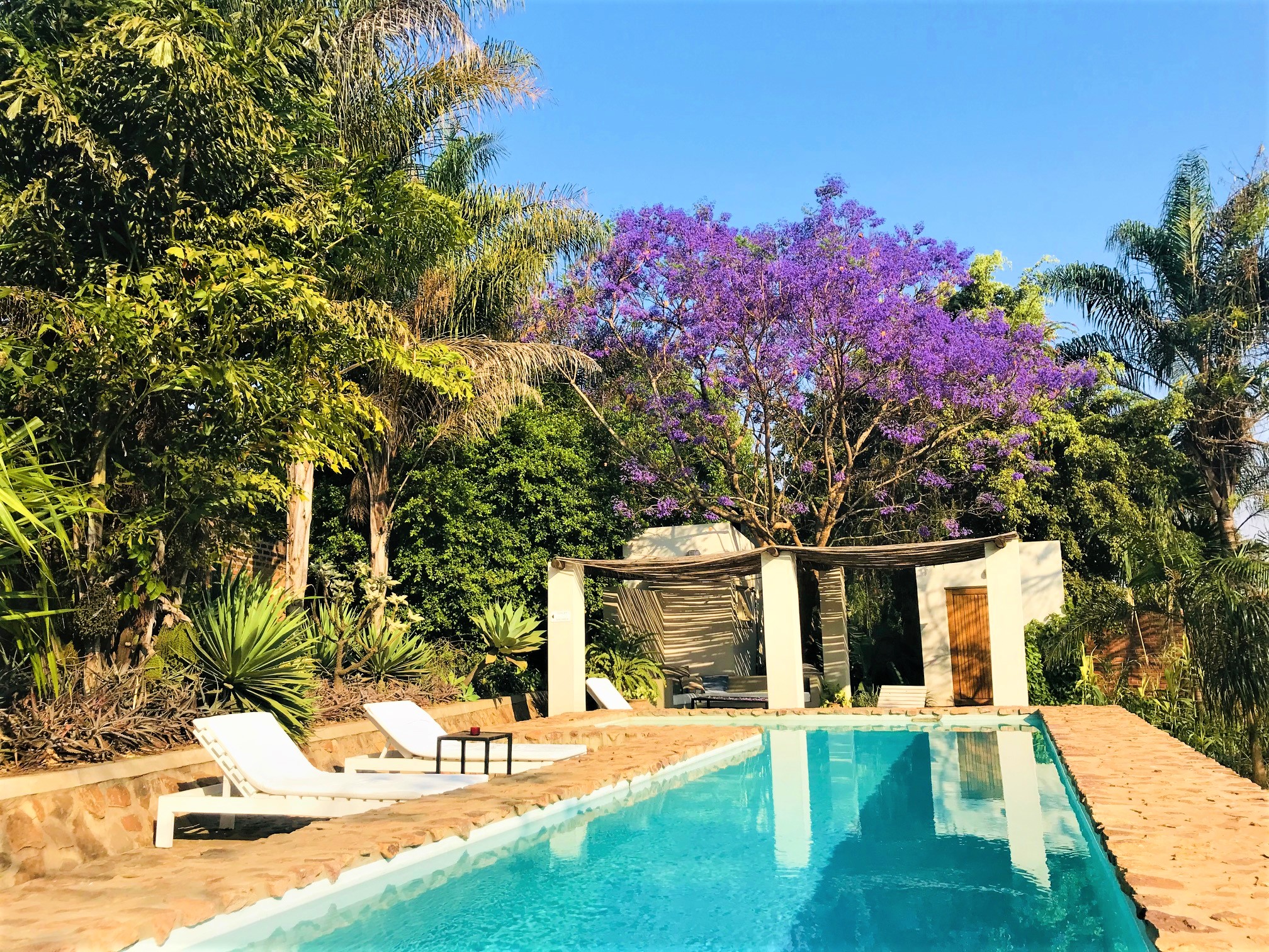 Take a refreshing dip in our serene outdoor pool surrounded by lush tropical gardens — the perfect way to unwind under the African sun.